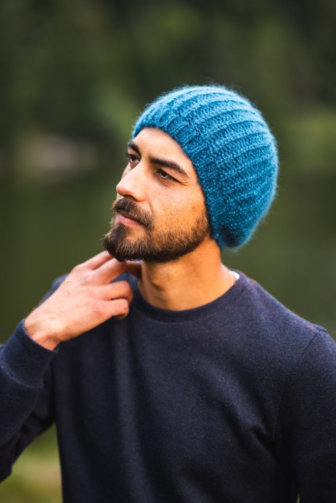 Bonnet pur mohair tricoté en côtes, très chaud et enveloppant.